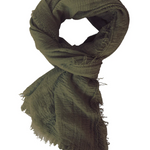 This gauze beauty has a naturally fringed eyelash edge that accompanies all styles. Wear as a scarf or shawl! Hand dyed by a weaving collective in Thailand.