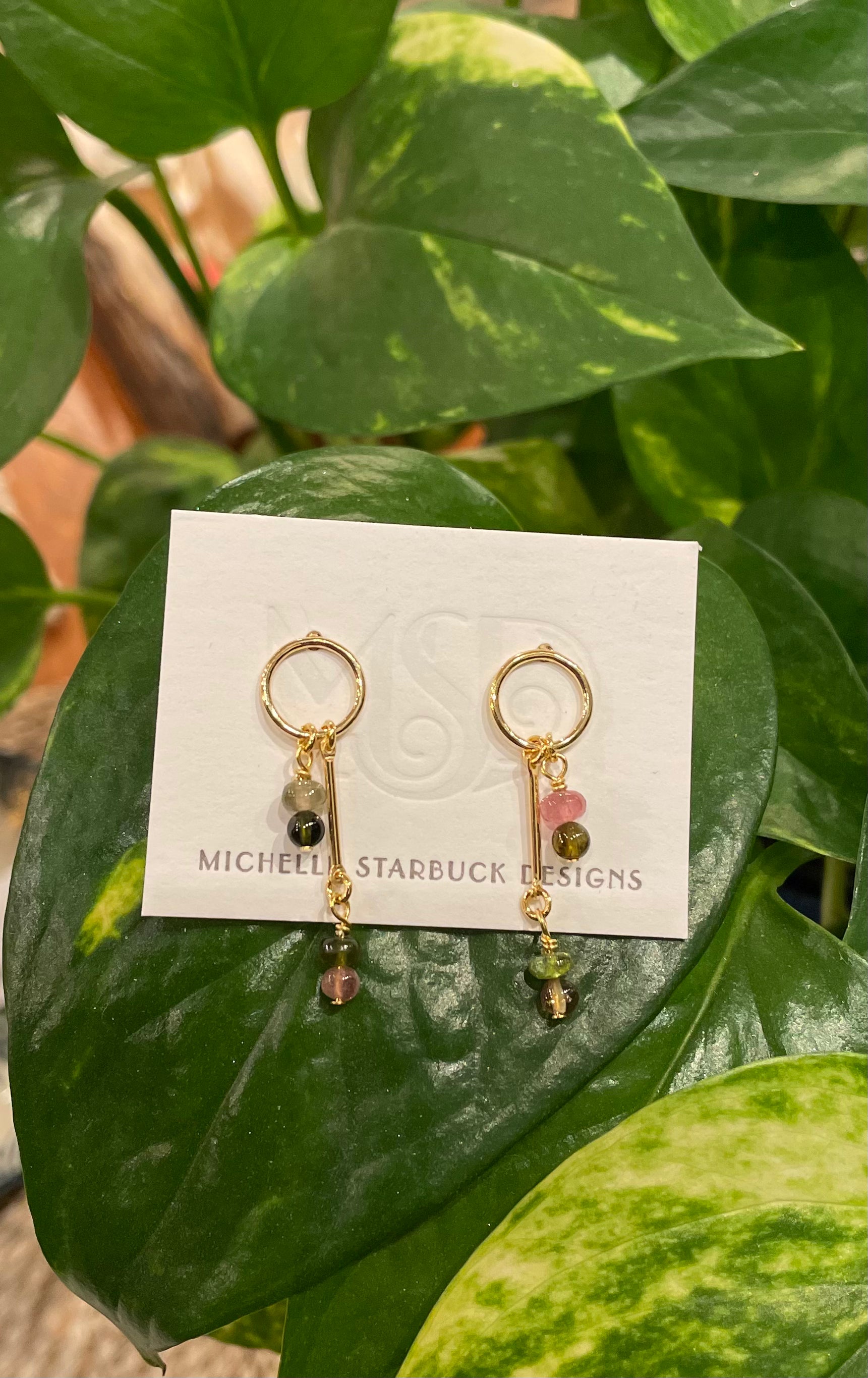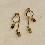 Charm earrings with Tourmaline gemstone beads in shades of green and pink.