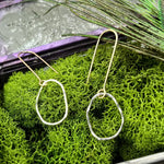 The Cheryl drop earrings feature organic sterling silver open hoops on gold-filled threader-style ear wires. Each pebble-inspired shape is hand-forged, soldered, shaped, and hammered. The mixed metals create beautiful contrast and movement.