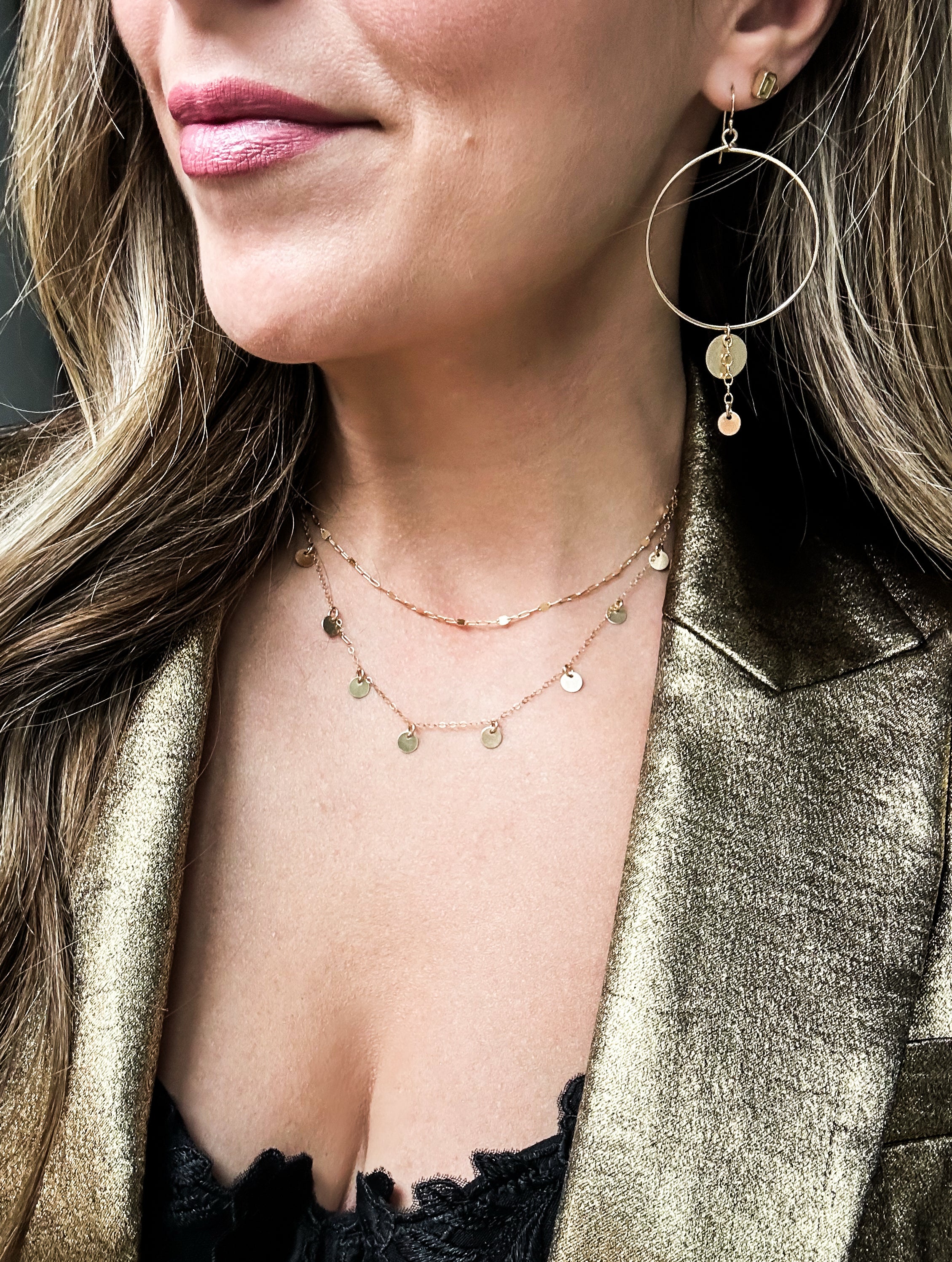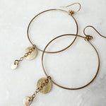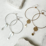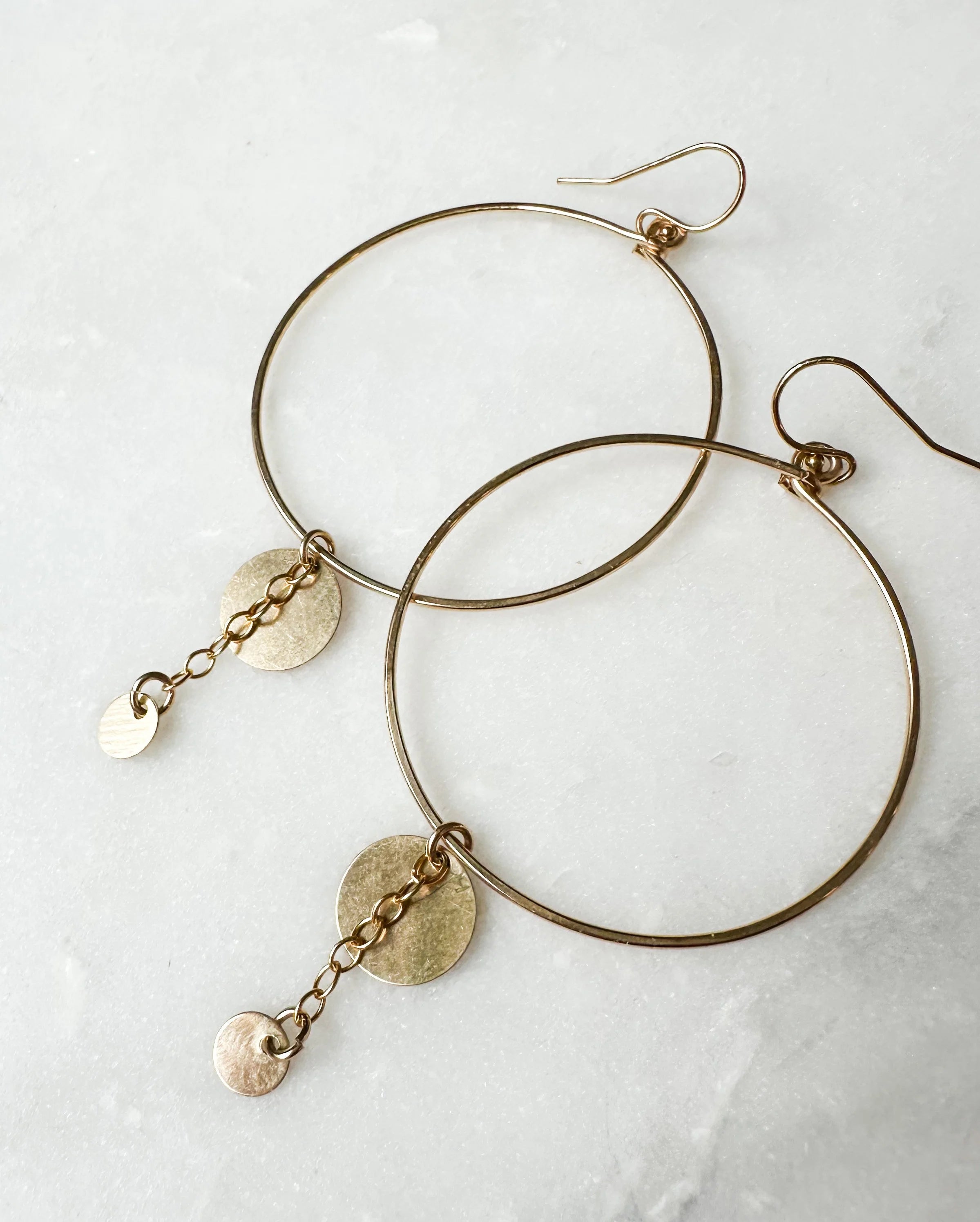 A coined classic hoop earring. Hand forged and hammered and adorned with mildly polished coin pendants suspended by a sturdy cable chain. The dangle and twist of these leveled up basics are anything but an ordinary hoop earring.