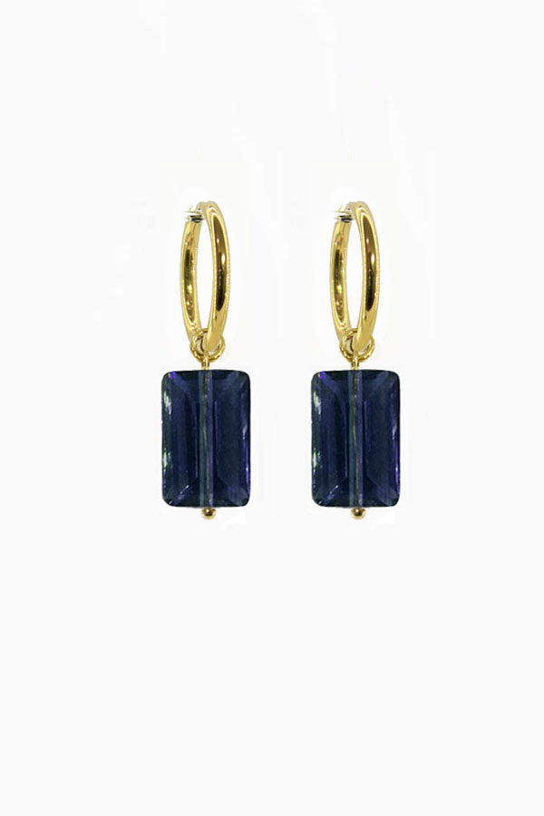 18k gold plated stainless steel hoops top faceted glass crystal rectangles. 1.3 inches, nickel free.