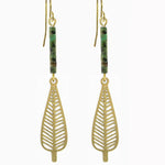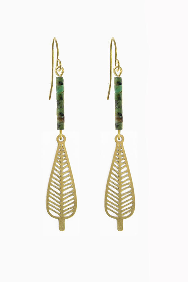 Brass cutout leaves topped by turquoise heishi beads. Brass ear wires. 2.5 inches, nickel free.