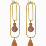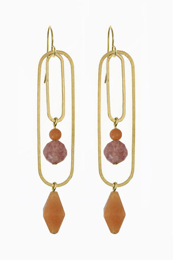 Red aventurine and strawberry quartz stones adorn concentric brass ovals that dangle brass ear wires. 3 inches, nickel free.