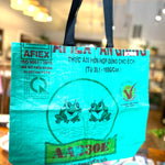 This fair trade recycled shopping tote is the ideal companion for the grocery store, farmer’s market, beach or your favorite boutique. Water resistant and super strong. Say goodbye to single use plastic bags and carry your items in sustainable style.