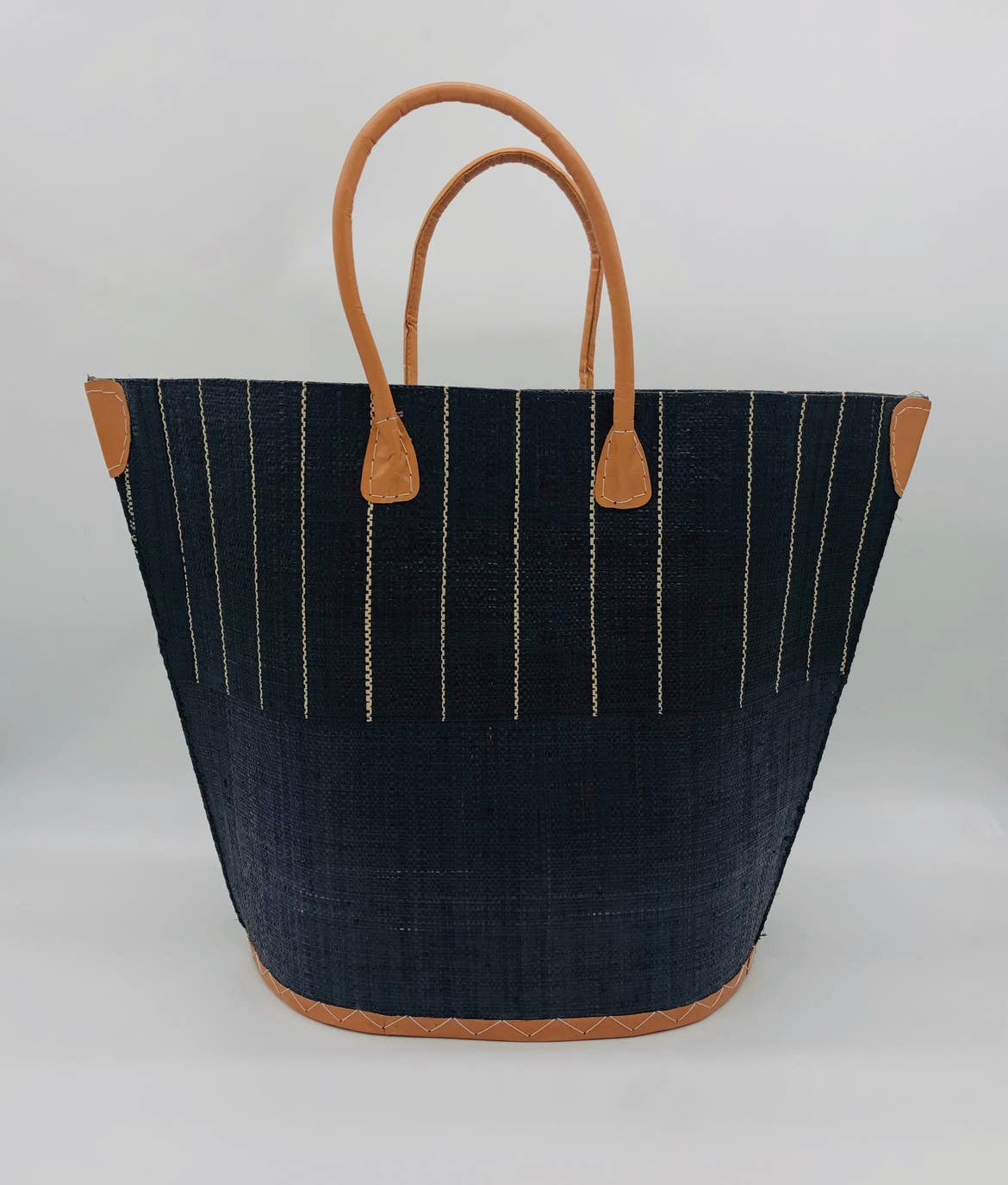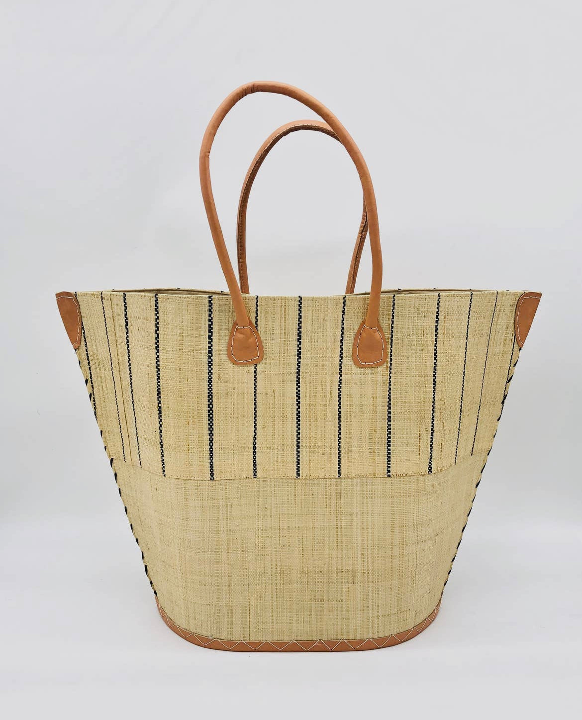 This elegant Santa Cruz Two-Tone Pinstripes Large Straw Bag is handmade from loomed raffia, with special attention to detail given to the leather handles, corners, and base binding. An internal pocket and drawstring closure provide security and convenience, while the roomy size offers ample storage. For convenience and lasting beauty, the bag can be easily brushed off with minimal effort.